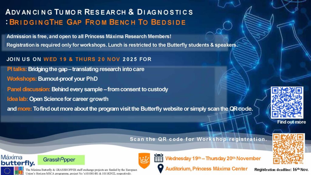 The Máxima Butterfly program offers 28 fully funded PhD positions. There are 52 different PhD projects to choose from, ranging from fundamental to translational to clinical science, and involving all pediatric tumor types. Candidates can apply until January 31st 2023.